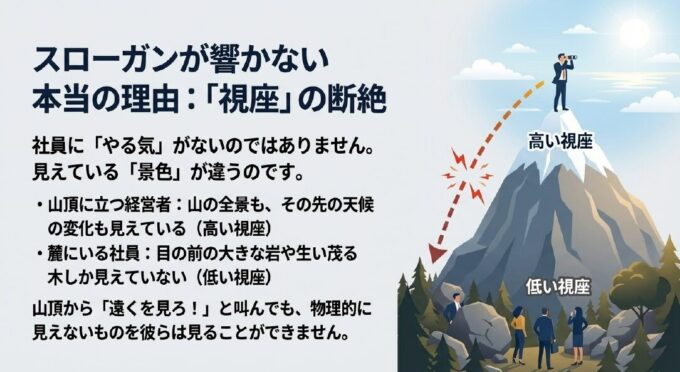 コンサルタント:「いいえ、違います。社長は山頂(経営層)に立ち、山の全景も、その先の天候の変化も見えています。これが『高い視座』です 。しかし、麓(現場)にいる社員さんは、目の前の大きな岩や生い茂る木しか見えていません 。視座が低い状態では、視野はどうしても狭くなるのです 。山頂から『遠くを見ろ(視野を広げろ)!』と叫んでも、物理的に見えないものを、彼らは見ることができない。これが『コミュニケーションの断絶』の正体です 」