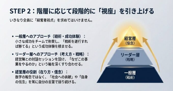 いきなり全員に「経営者視点」を求めてはいけません。階層に応じたアプローチが必要です。