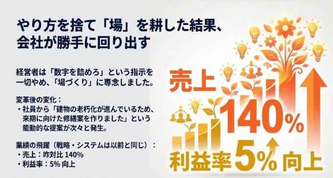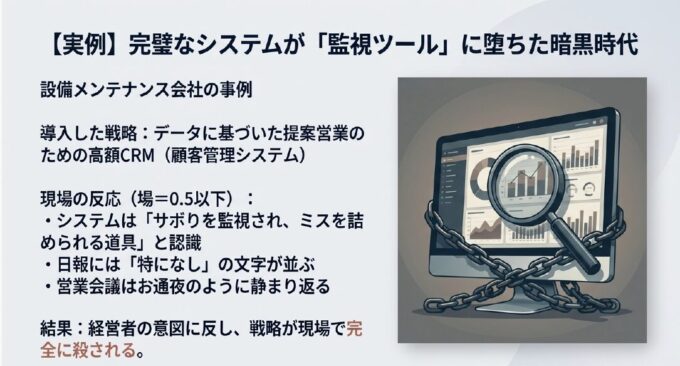 この会社では、社長が導入した最新の「営業戦略」が、現場の「場」の悪さによって完全に腐っていました。