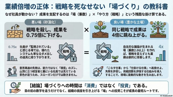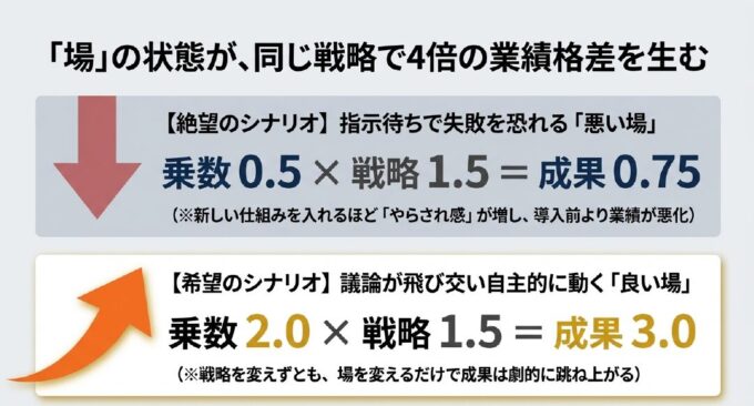 戦略を変えずとも、「場」を変えるだけで、成果は4倍(0.75から3.0へ)跳ね上がるのです 。 これこそが、最強組織が持つ「掛け算」の正体です。