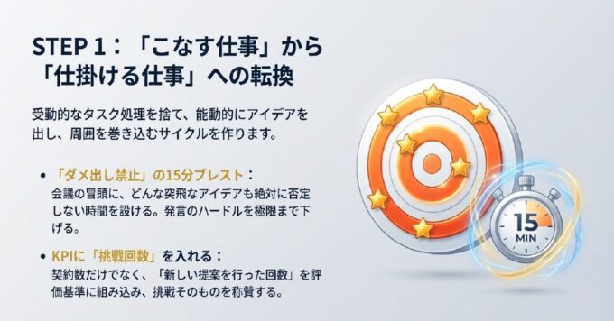 • 「ダメ出し禁止」の15分ブレスト: 会議の冒頭に、どんな突飛なアイデアも否定しない時間を設けます。発言のハードルを極限まで下げることが、「仕掛ける」空気を作ります 。