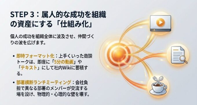 属人的な成功を組織全体の資産に変え、仲間づくりの波を広げます 。