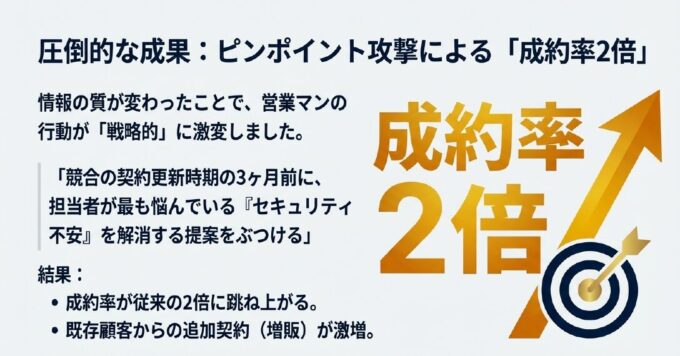結果として、成約率は従来の2倍に跳ね上がり、既存顧客からの追加契約(増販)が激増しました。