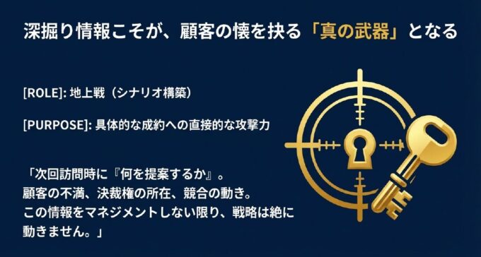 「深掘り情報こそが、顧客の懐を抉り、YESを引き出す『真の凶器』となる」を頭に叩き込んでください。
