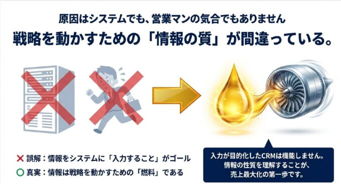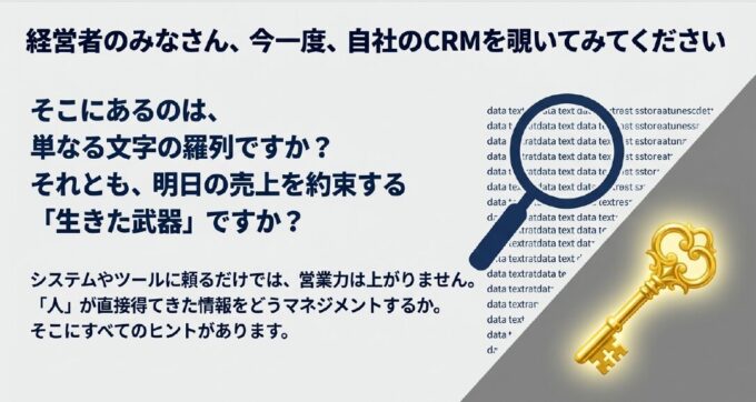 B社長:「先生、うちは最新のクラウド型CRMを導入して、全社員にタブレットを配りました。でも、入ってくるのは『A社訪問、進捗なし』といった一行だけ。これでは戦略の立てようがありません。」