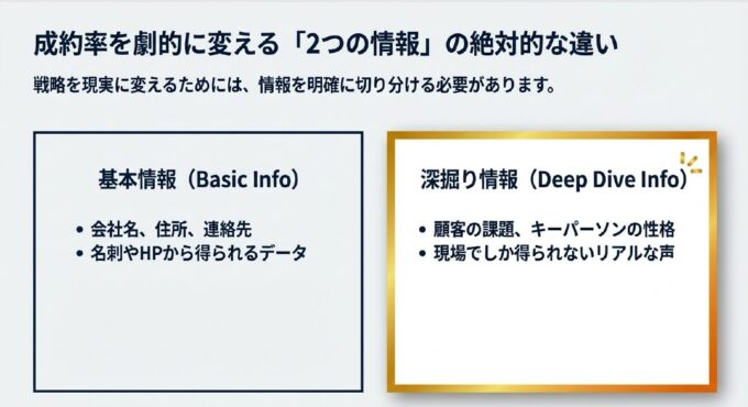 戦略を現実に変えるためには、情報の性質を「基本情報」と「深掘り情報」の2つに明確に分ける必要があります。