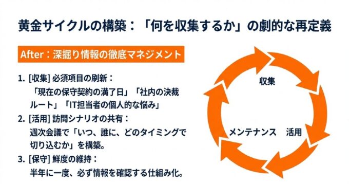 1. 収集の再定義: 基本情報に加え、「現在の保守契約の満了日」「社内の決裁ルート」「IT担当者の個人的な悩み」を必須項目に設定。
