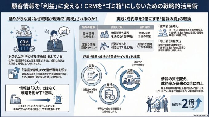 コンサルタント:「それは、システムが単なる『デジタル住所録』になっている証拠です。社長が立てた『既存顧客へのクロスセル戦略』には、住所や電話番号ではなく、『今、お客様がどんな不満を抱え、誰が決定権を握っているか』という生きた情報が必要なはずです。 その『深掘り情報』が欠落しているから、戦略が『絵に描いた餅』になるのです。」
