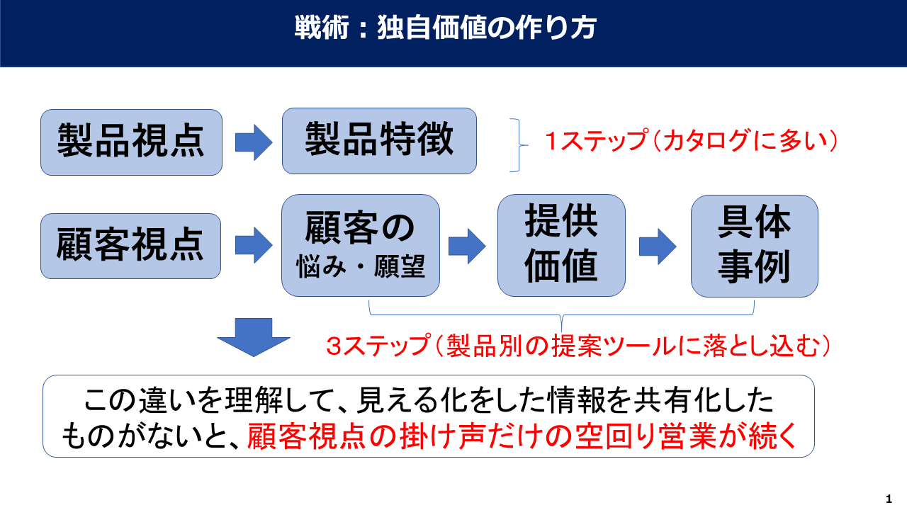 このことが、理解できると、当社が実施している主力製品の価値提案シート(A3用紙1枚)の重要性が分かります。そう、価値提案シートの見える化です。もし、価値提案シートの見える化に取り組んでいなければ、当社ホームページのコンサルティングのページを参照してみてください。