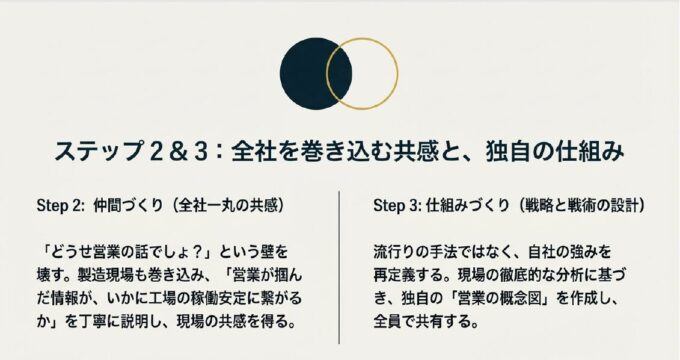 2. ステップ2(仲間づくり):営業だけでなく製造現場も巻き込み、「営業が掴んだ情報が、いかに工場の稼働安定に繋がるか」を丁寧に説明。現場の「共感」を得ることに奔走しました 。