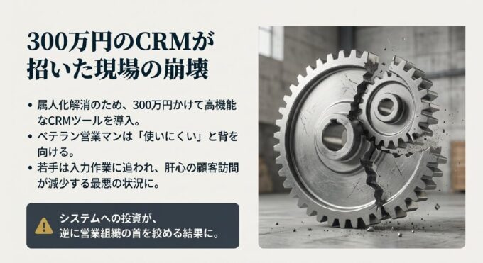 しかし、ベテランは「使いにくい」と背を向け、若手は入力作業に追われて肝心の顧客訪問が減るという最悪の状況に陥りました。
