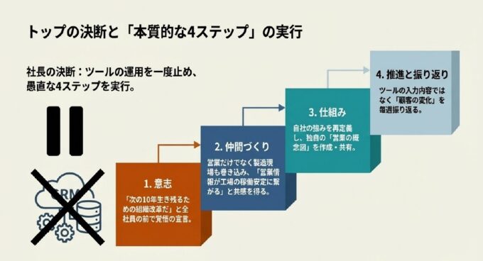 社長は一度ツールの運用を止め、本稿で紹介する「4つのステップ」を愚直に実行しました。