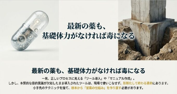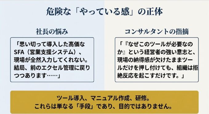 コンサルタント:「そこに落とし穴があります。『なぜこのツールが必要なのか』という経営者の強い意志と、現場の納得感(仲間づくり)が欠けたままツールだけを押し付けても、組織は拒絶反応を起こすだけなのです。最新の薬を飲ませても、土台となる体力がなければ逆効果なのと同じですよ」