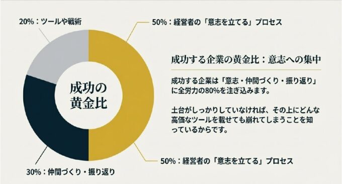 特に、最初の「意志を立てる」プロセスに50%ものエネルギーを割くのが成功事例の特徴です 。