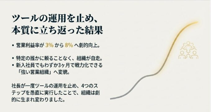 1年後、A社の営業利益率は3%から8%へ向上。特定の誰かに頼ることなく、新入社員でも3ヶ月で戦力化できる「強い営業組織」へと変貌を遂げたのです。