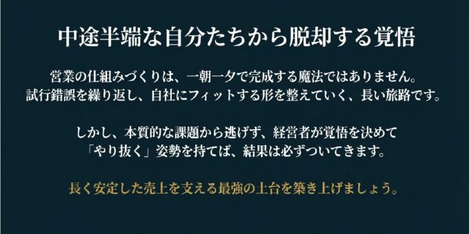 しかし、断言します。本質的な課題から逃げず、経営者が覚悟を決めて「やり抜く」姿勢を持てば、結果は必ずついてきます 。