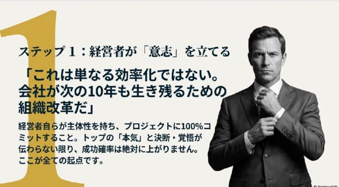 1. ステップ1(意志):社長自ら「これは単なる効率化ではなく、A社が次の10年も生き残るための組織改革だ」と全社員の前で宣言し、決悟を示しました 。