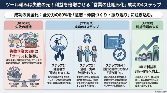 本稿では、数多の失敗事例から導き出された「成功の黄金比」と、組織を劇的に変える4つの本質的なステップを明かします。