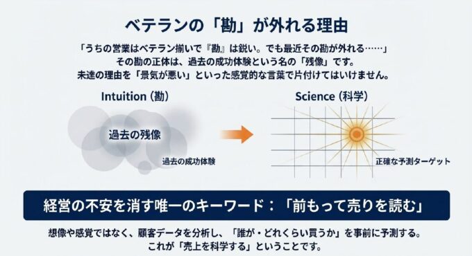 私:「社長、その『勘』の正体は何だと思いますか? それは、過去の成功体験という名の『残像』です。今の時代、お客様の動きはデータで追わなければ見えません。御社の売上目標、具体的な裏付けはありますか?」