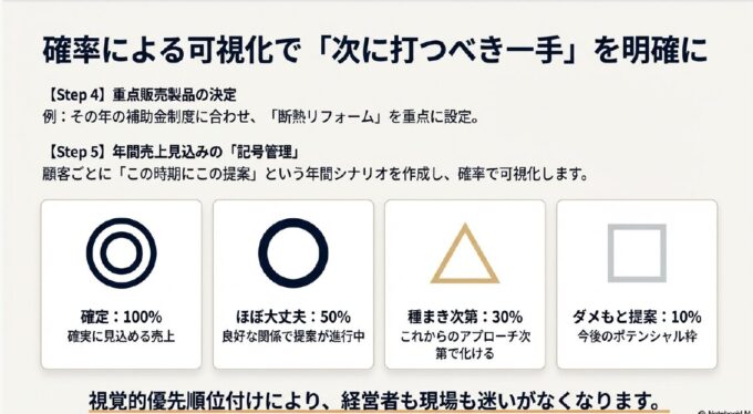 5. 増販シナリオ作成:顧客ごとに「この時期に外壁塗装の提案、確度は50%」といった具体的な年間シナリオを作成 。