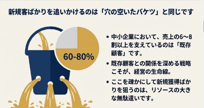 ここを疎かにして新規客ばかりを追いかけるのは、穴の空いたバケツに水を注ぐようなものです 。