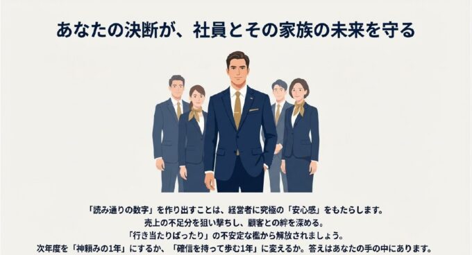 次年度を、また「神頼みの1年」にしますか? それとも、「確信を持って歩む1年」に変えますか? その答えは、あなたの手の中にあります。