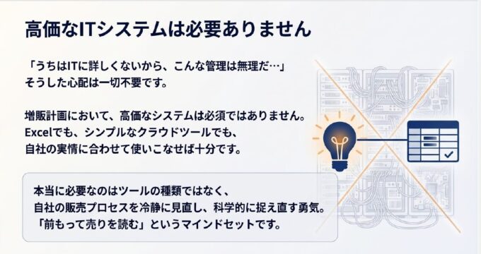 この「増販計画」において、高価なシステムは必須ではありません 。Excelでも、シンプルなクラウドツールでも、自社の実情に合わせて使いこなすことが最重要です 。