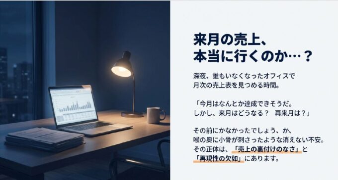 もしあなたが、喉の奥に小骨が刺さったような消えない不安を常に抱えているとしたら、そして、その不安の正体が「売上の裏付けのなさと、再現性の欠如」にあると気づいているとしたら、この記事はあなたのためのものです。