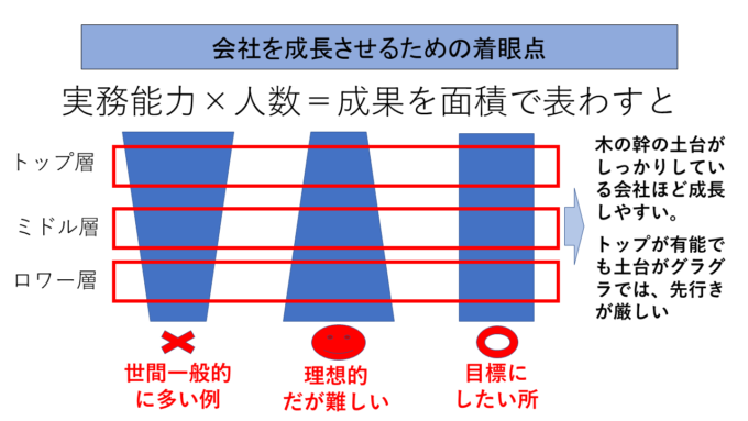 ただ、この図で言いたいことは、トップ層が現場から離れても若手が成果という面積比でトップ層を補う実力を伴っている状態になるような体制になっていれば、会社が成長していくということです。(トップ層は方針作成や戦略構築だけに専念できる体制のことを言っています)