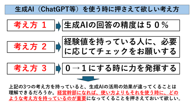 考え方の1の「生成AIの回答の精度は50%」というのは、生成AIを100%信用するのではなく、それを土台として次のステップの考える材料として使うということです。