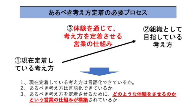 ステップ3:新しいあるべき考え方を定着させるために、どのような体験をさせるのかという営業の仕組みが構築されているか