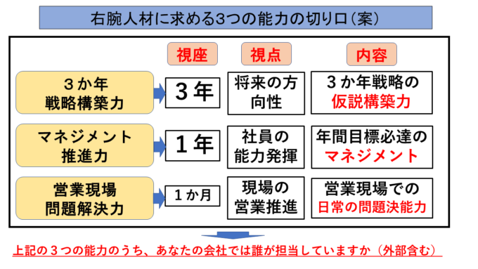 この3つのうち、経営者が見落としがちな着眼点を補足できる人材が右腕人材になります。