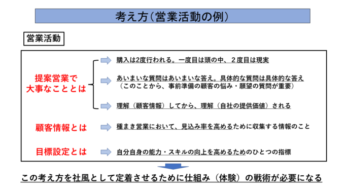 この会社は、多くの考え方を言語化するのではなく、まずは、「明確さは力なり」の考え方の1点を営業リーダーに軸にしてもらうための仕組み化に取り組まれました。