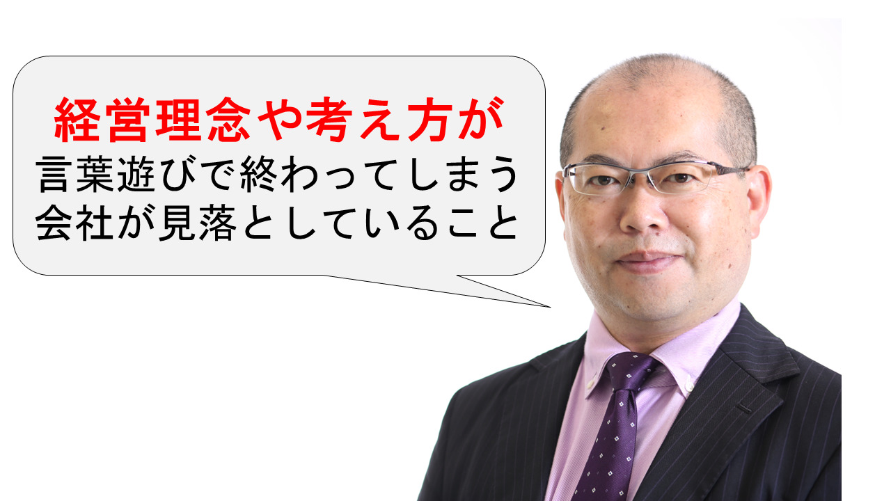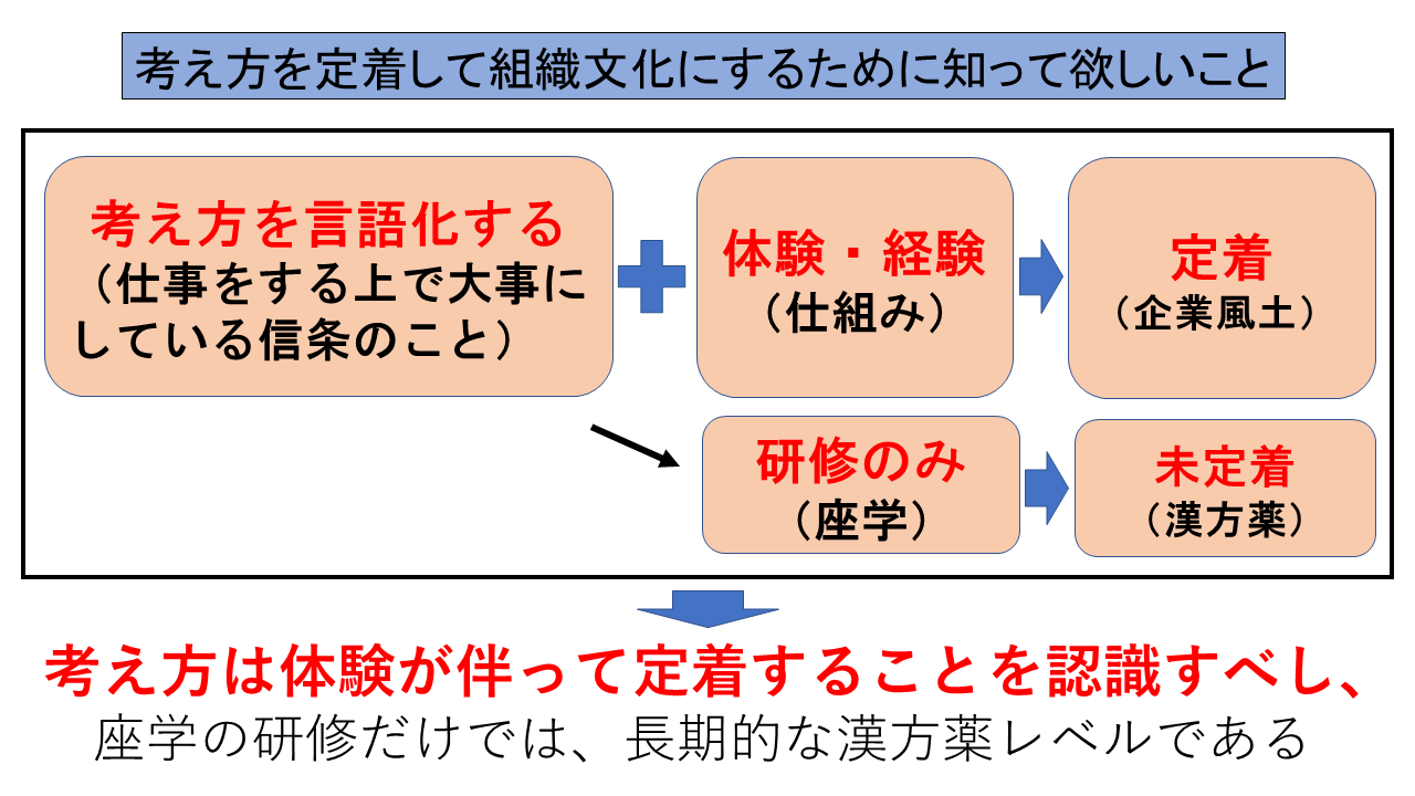 よって、いくら素晴らしい考え方が言語化されていても、体験・経験をする仕組みができていないと、考え方は単なる言葉遊びで終わるということです。
