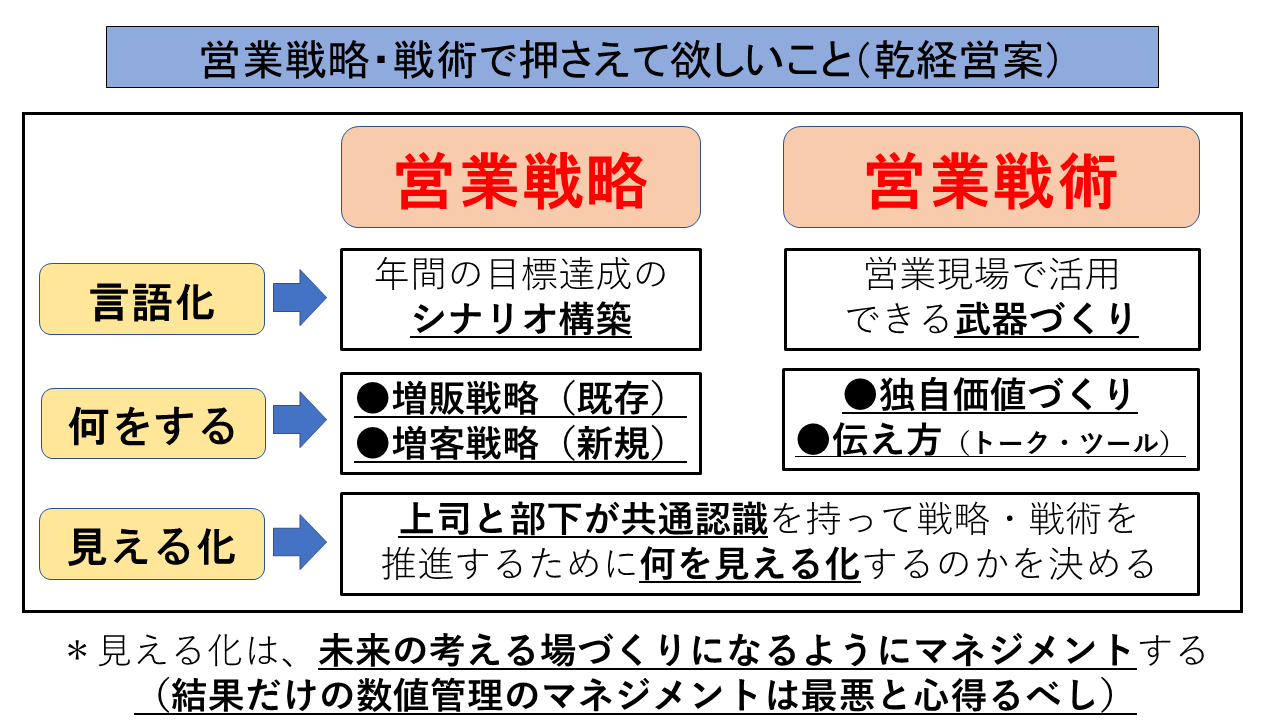 雑談ですが、ある会社では、金融機関に見せている会社方針の冊子に営業戦略と営業戦術の両輪を機能させるということが書いてありました。