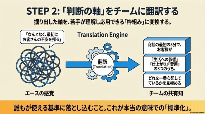 必要なのは「翻訳」です。エースの言語を一度解体し、その背後にある「判断の軸」「顧客の見方」「優先順位の付け方」を取り出す。