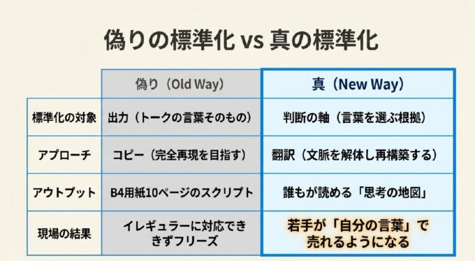 ・ 営業トークの「言葉」だけを標準化しても、現場では機能しない。