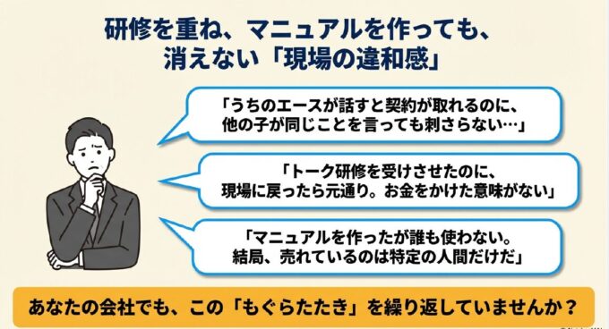 「研修をしてもトークが広がらない」「マニュアルを作っても使われない」——そう感じてきたあなたの違和感は、本物です。