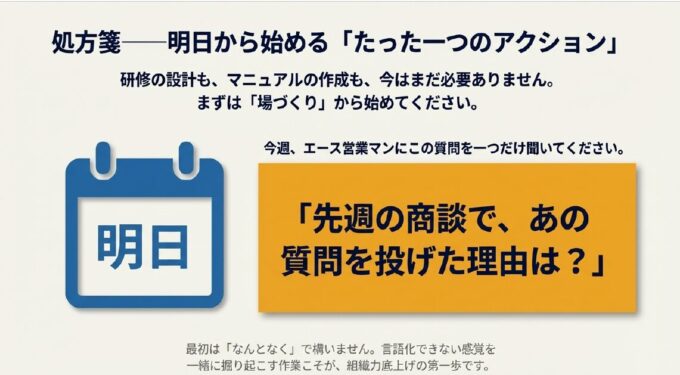 「先週の商談で、あの質問をした理由は?」「あのタイミングで話題を変えた根拠は?」——こうした問いかけを、週に一度、30分だけ実施する。