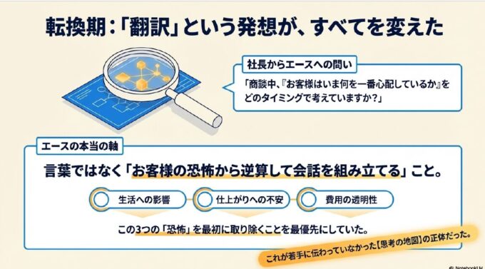 言葉ではなく、「お客様の恐怖から逆算して会話を組み立てる」という思考の軸。これが、他の担当者には伝わっていなかったものでした。