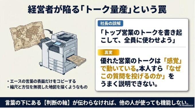 これが「トーク量産の罠」です。優れた営業トークには、言葉の下に必ず「なぜその言葉を選んでいるのか」という判断の軸が存在します。