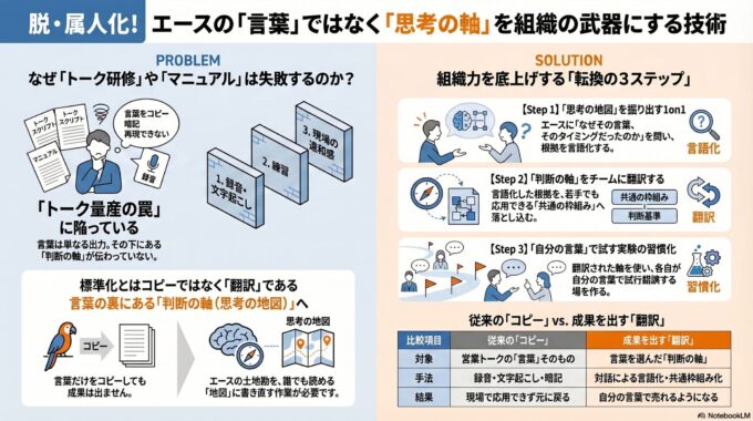 営業トークの「翻訳と標準化」から始める、中小企業の組織力強化の実践ガイドです。