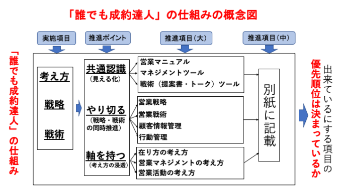 文章にすると、そんな会社はないだろうと思われるかもしれませんが、営業マニュアル(営業の仕組み)の全体像が分かると、その取り組みが本当に優先順位として高いのかを一発で見抜くことが分かります。