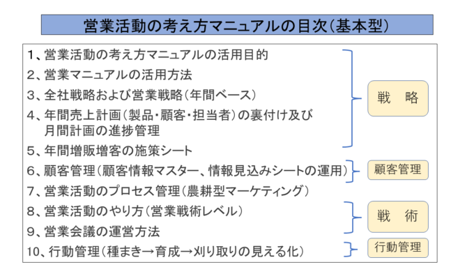 具体的には、当社が推奨している営業マニュアルの基本の型の目次に沿って、営業マニュアルを作ってはいけないということです。