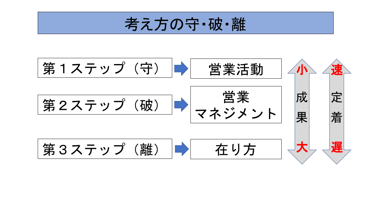 復習を兼ねて、183話のコラムに掲載した、営業活動の考え方の守・破・離の図を以下に記します。