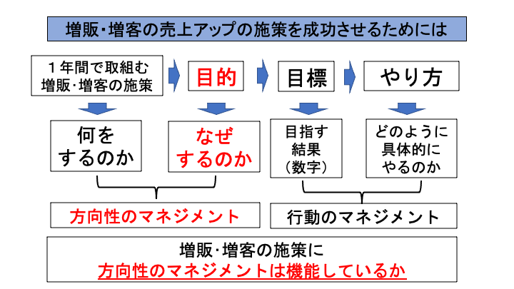 目的は、方向性のマネジメントです。目標とやり方は行動のマネジメントです。