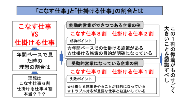 一方、受動的営業の会社は、「こなす仕事」が9割で「仕掛ける仕事」が1割の状態になっているように感じています。