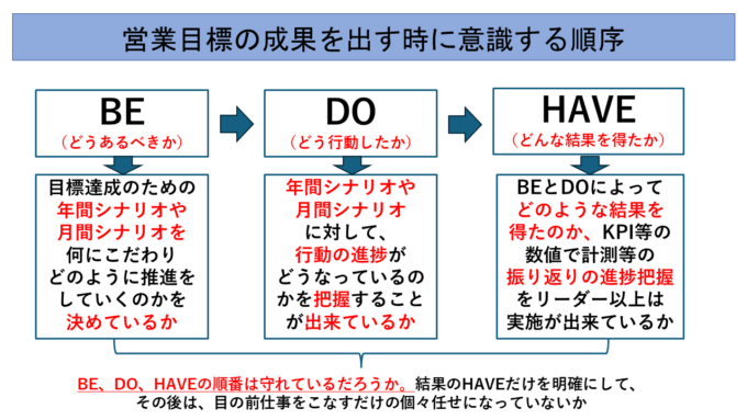 ここに正解・不正解は求めませんが、上記の図で言えば、HAVE(結果)を求める数値は持っているが、それを実現するためのBE(どうあるべきか)と実現するための行動のDO(どう行動したか)が曖昧になっているということです。