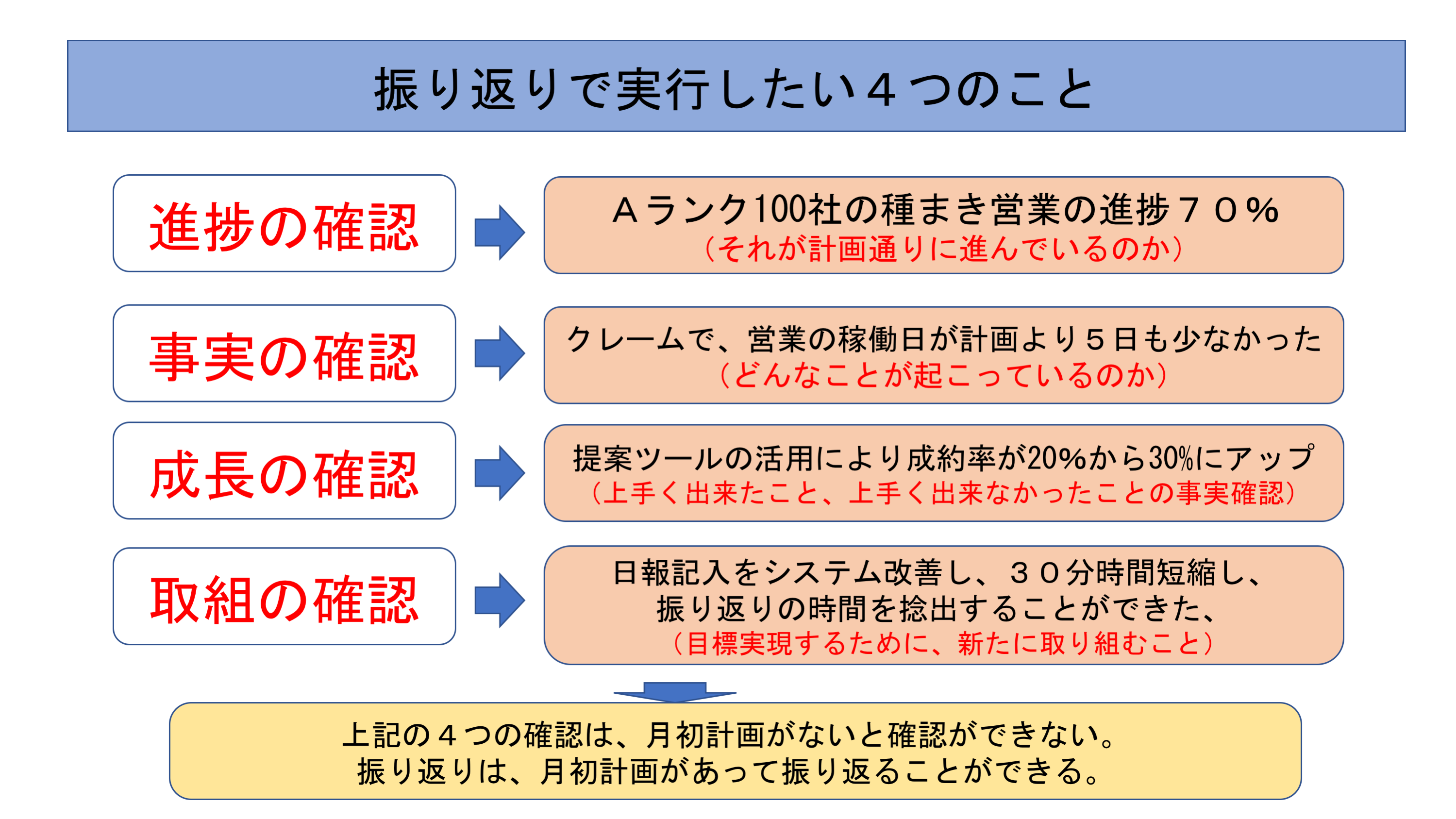 これは、営業リーダーが、振り返りに対しての考え方が、「日々の業務の取り組み内容と反省を行う」になっていたからです。