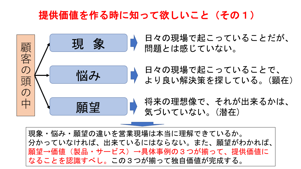 コンサルティング現場では、主力製品の価値をキーワードにして、その価値は、顧客のどの悩みや願望を解決するのかを書き出す演習を行っていただいています。
